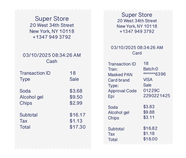 Card receipt: Show only the total paid via card (higher).