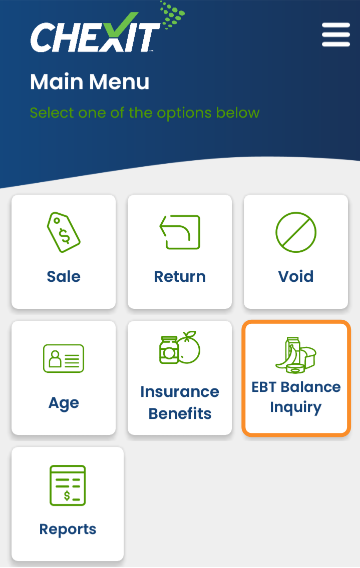 To process an EBT Balance Inquiry, start from the CHEXIT Main Menu, then select the EBT Balance Inquiry button.
