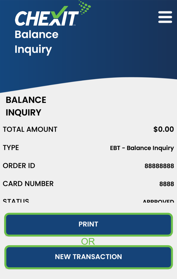 A receipt will print for the customer with their EBT balance, then the CHEXIT Balance Inquiry screen will display the transaction details along with two options: