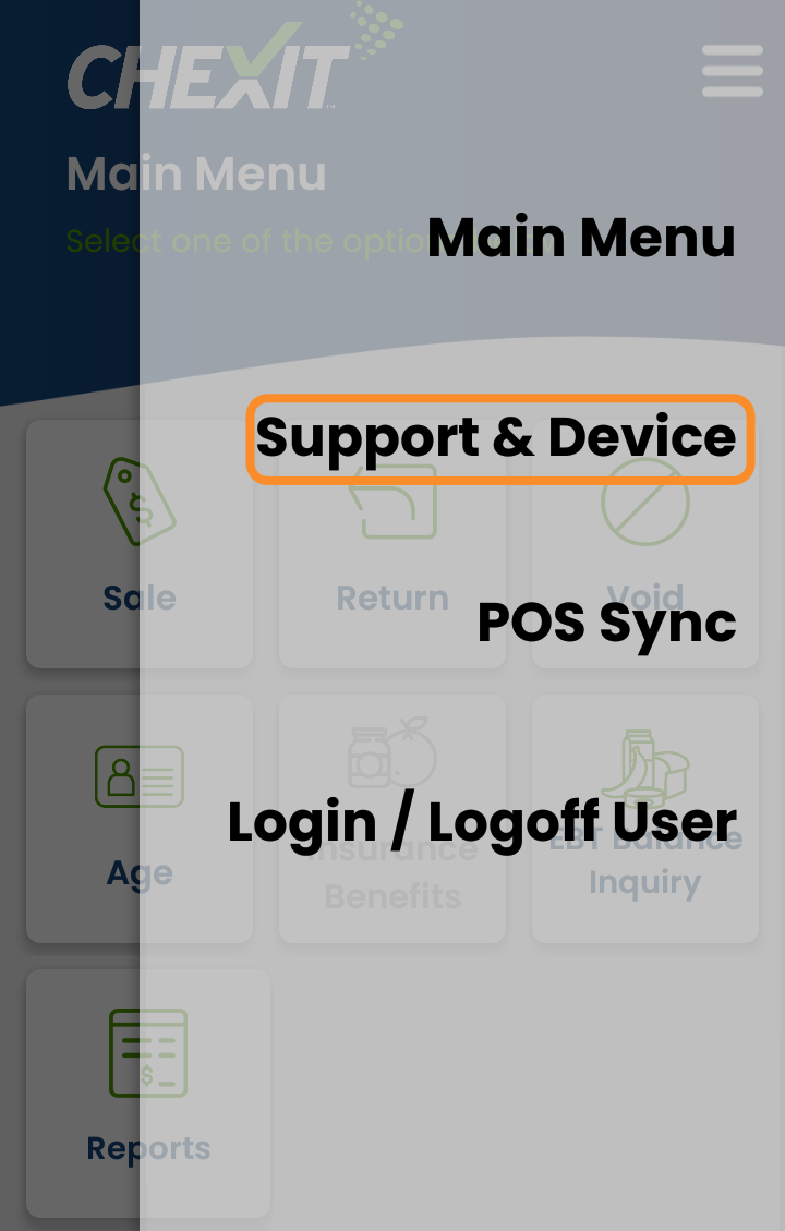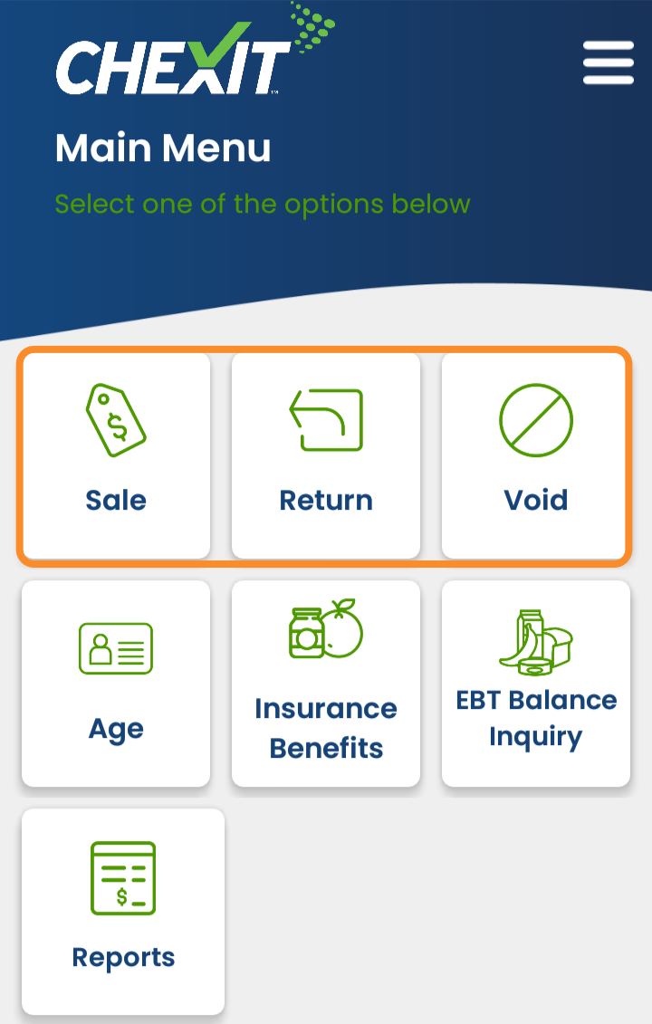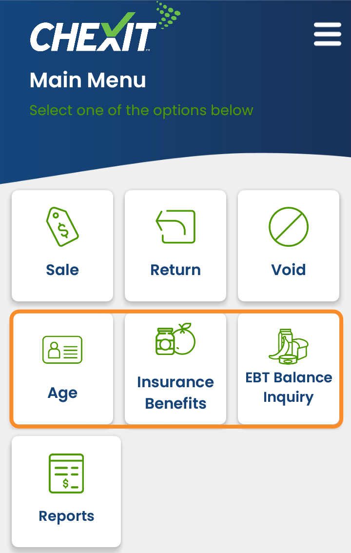 The first row of tiles on the CHEXIT Main Menu screen will be used to accept and manage payment transactions for SNAP, Cash Benefits, and Credit and Debit.