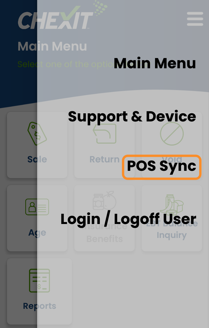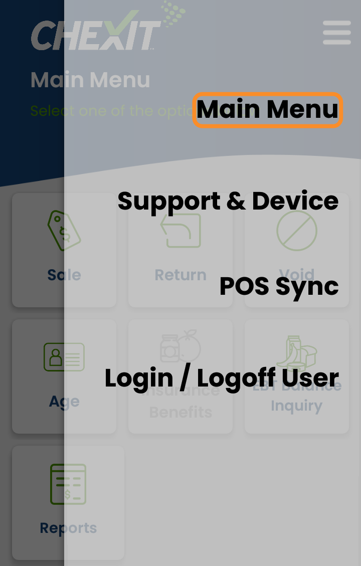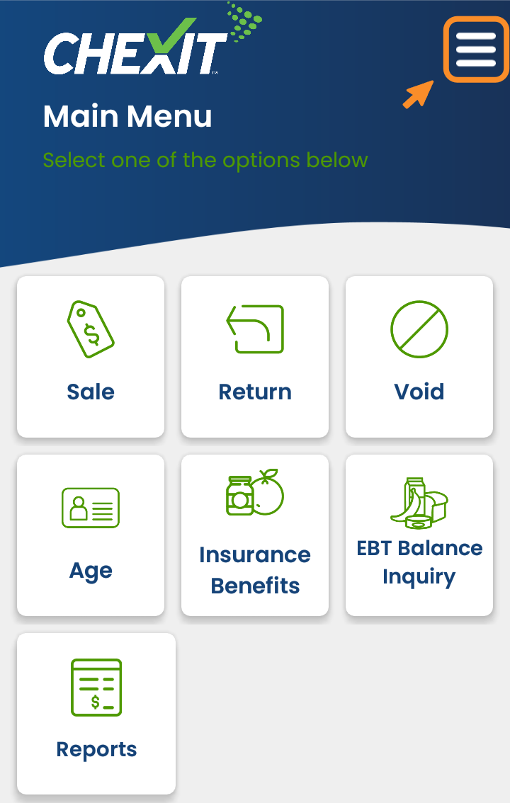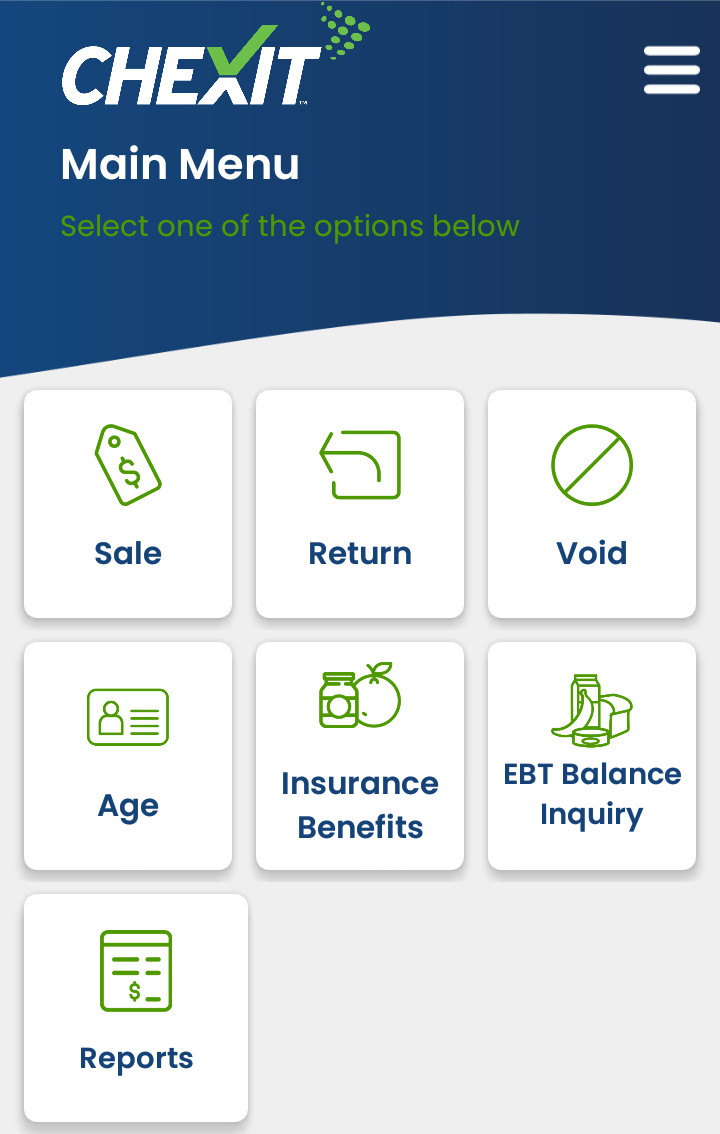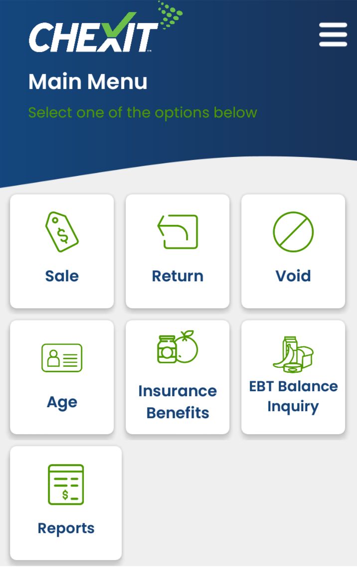 The CHEXIT Main Menu screen is a tile-based, grid layout which allows for easy navigation between different transaction types, administrative functions, and optional modules.