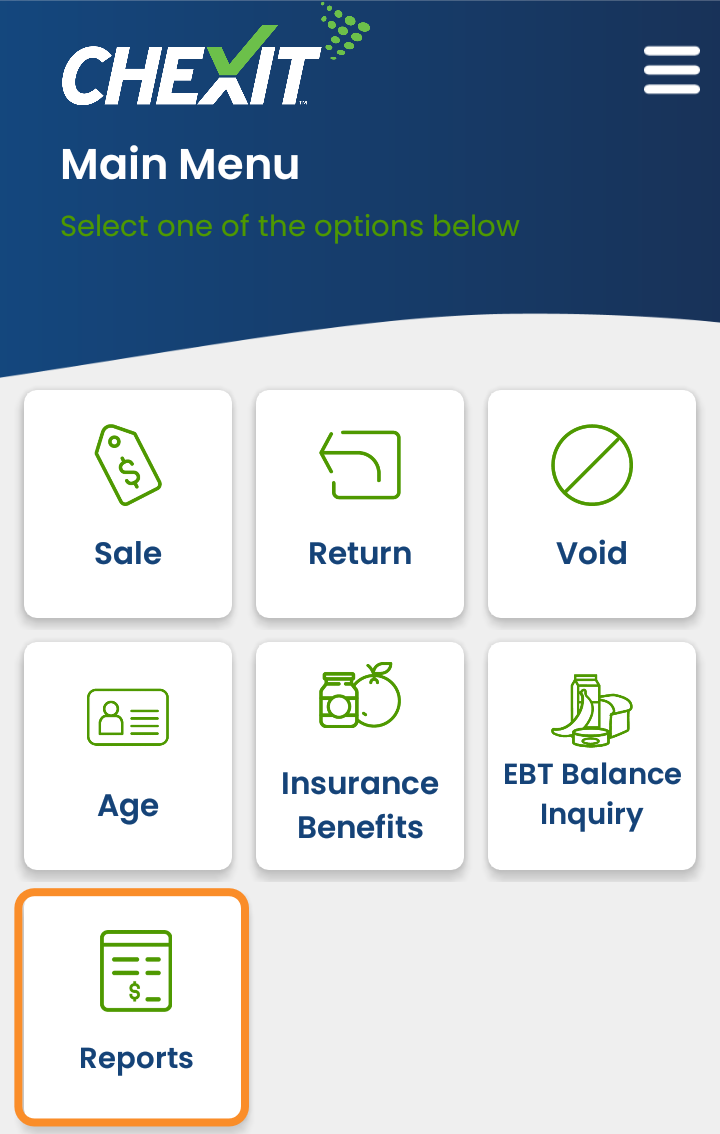 The third row contains the Reports tile, which allows you access to various transaction reports from your business day.